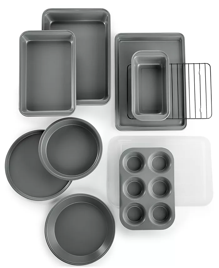 10-piece set includes: 13" x 9" x 2" pan with cover, 8" round cake pan, 10" x 7" brownie pan. 6-cup muffin pan, 8.5" x 4.5" x 2.25" loaf pan, 9" pie pan, 10" round pizza pan, 13.75" x 11" cooling rack, 13" X 9" cookie sheet. Durable design with non-stick interiors, Oven safe to 450° except for cooling rack, lid, Manufacturer's limited lifetime warranty, Created for Macy's, Carbon steel, Dishwasher safe.